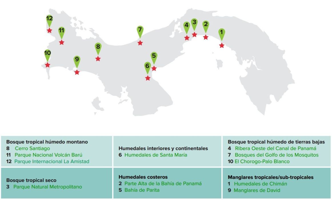 De las 53 IBA existentes en el país, Audubon Panamá ha centrado sus esfuerzos de conservación en las IBA Parte Alta de la Bahía de Panamá y Humedales de Chimán y El Chorogo-Palo Blanco. Adicionalmente, se han identificado nueve áreas de trabajo en las cuales esperamos contar con apoyo para poder realizar acciones coordinadas de conservación: Parque Natural Metropolitano, Ribera Oeste del Canal, Bahía de Parita, Humedales de Santa María, Bosques del Golfo de los Mosquitos, Cerro Santiago, Manglares de David, Parque Nacional Volcán Barú y Parque Internacional La Amistad.