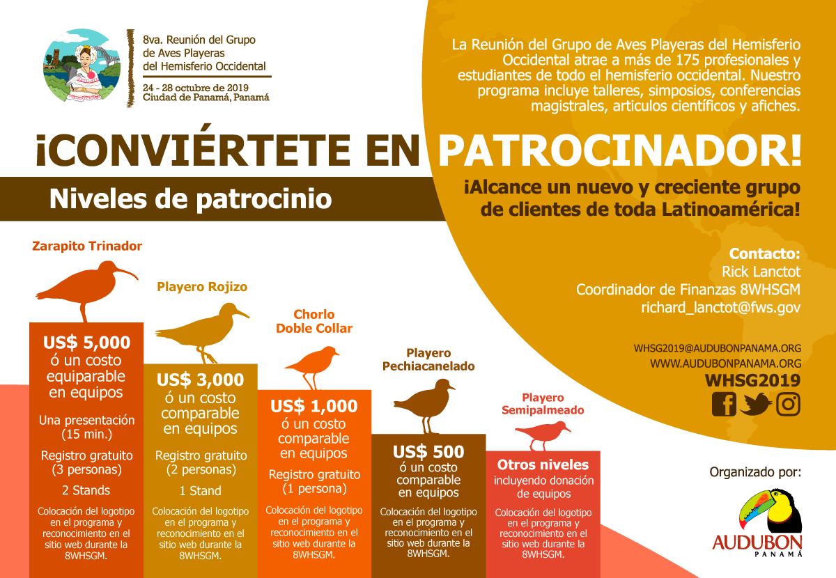 Los patrocinantes y sus exposiciones recibirán la máxima visibilidad, gracias a los stands, ubicados centralmente en la sala de exposiciones, donde se realizará la exposición de pósters, los coffee breaks y otras actividades sociales. Ver más en _WHSG8_Patrocinadores_flyer_22May2019__Espanol_Finalrmr.png